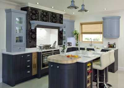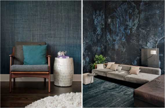 На фоне темного серо-синего цвета хорошо прорисовывается форма светлых предметов, поэтому в дизайне можно использовать решетчатые объекты или причудливые формы светильников. Удивительно выглядит на этом фоне сочная зелень в коричневых глиняных горшках. Для мягкого синего в интерьере очень важна фактура пола, она должная быть как можно ближе к природной: шероховатой, с цветовыми переливами, желательно намного светлее сине-серого, но если темная, то разделена от цвета стены широким белым плинтусом.