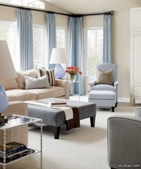 Наиболее спокойные вариации получаются при совмещении со светло-синим. Союз синего и кремового цвета работает как в интерьерах современных стилей, так и классических.