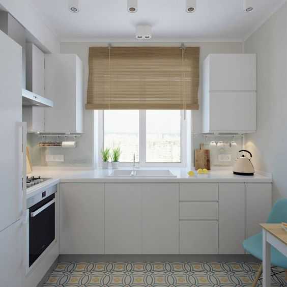 - Светлая палитра визуально расширяет границы тесного и непропорционального кухонного пространства.