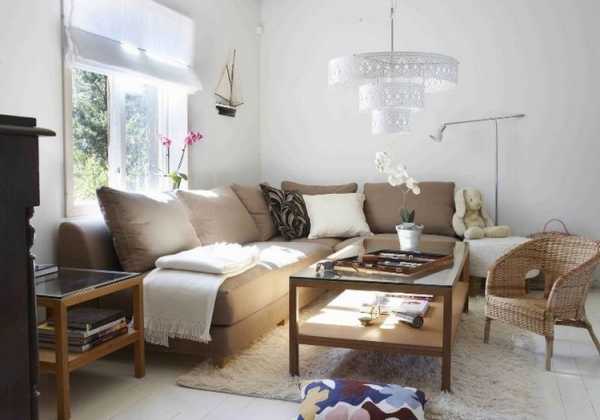 Если в дизайне допускаются и другие цвета, то интерьер возможно разбавить яркими аксессуарами. Ими могут стать шторы, скатерть на столе, подушки на диване, стулья. Также можно повесить картину или яркую люстру. Как вариант, при использовании натуральных материалов в общий пейзаж впишутся комнатные растения.