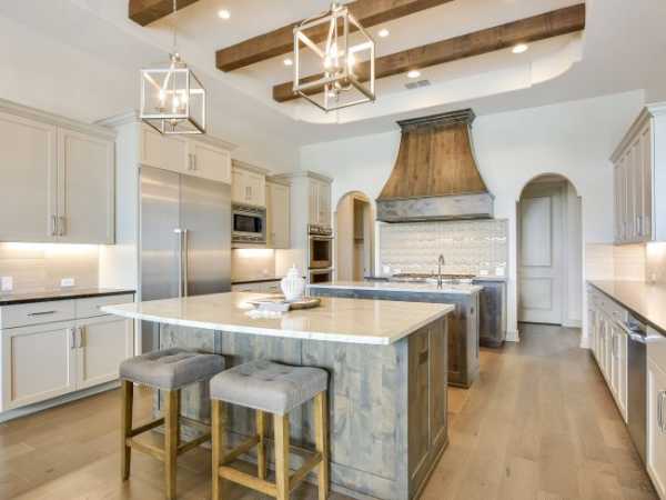 Бежево-серый цвет кухни хорошо сочетается с натуральным теплым оттенком деревянных балок
