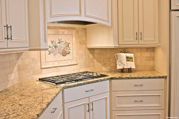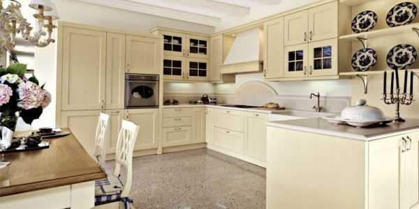 В классическом интерьере, даже несмотря на обилие светлых тонов, намного меньше лёгкости и изящества чем в том же провансе. Деревянный массив гарнитура смотрится громоздко — не спасает окрашивание ни в один из оттенков бежевого, шторы смотрятся тяжеловато, а дорогая плитка на фартуке добавляет излишней чопорности. В интерьере часто используют деревянные панели для отделки стен и декоративные угловые накладки. Нередко встречает резьба на деталях из дерева.