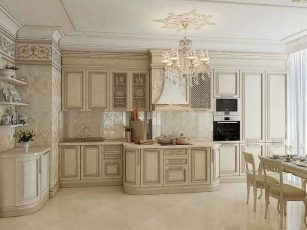 Так как беж спокойный, отнюдь не кричащий цвет, он хорошо вписывается в классические варианты кухонь. Торжественные и немного помпезные ампир, барокко, рококо, античность, ар-нуво в любом оттенке бежевого выглядят роскошно.
