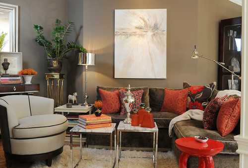 С какими цветами сочетается бежевый в интерьере? Посмотрите, как выгодно на фото-примерах прохладный тон серо-бежевого (таупового) оттеняет теплый и согревающий терракотовый. Едва ли можно представить на его месте нечто более гармоничное. Даже сочный алый цвет не выглядит в интерьере гостиной слишком броским, скорее — вишенкой на торте «крем-брюле.
