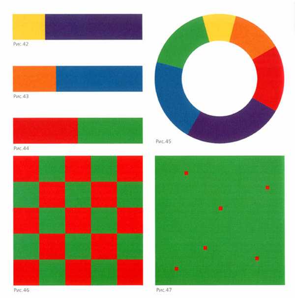Написанный в меньшем количестве и занимающий меньшую площадь, попавший, так сказать, «в беду», цвет реагирует, обороняется и производит относительно более яркое впечатление, чем если бы он был использован в сгармонизованных пропорциях, как на рисунке 46. Этот факт известен как биологу, так и садоводу.