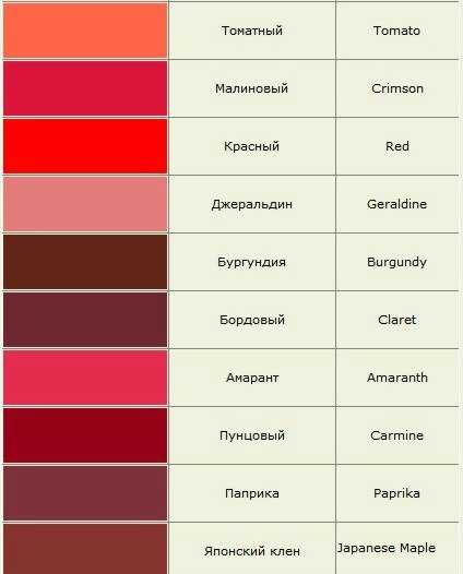 Начнем с начала видимой части спектра — с красного. В таблице ниже приведены образцы и названия оттенков красного, цвета силы и мощи.