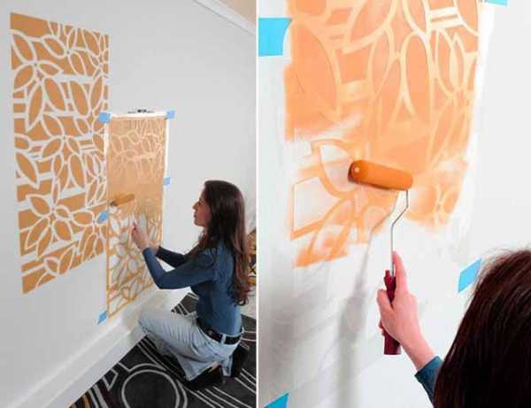 В зависимости от цвета основания и ваших навыков красить стенки нужно от 2 до 4 раз. Задача – тщательно закатать темные (или светлые) полосы и пятна. По окончании, когда последний слой водоэмульсионной краски высохнет, наложите через трафарет выбранный рисунок.