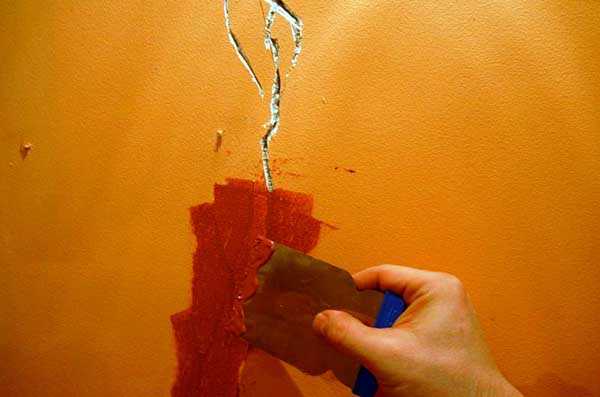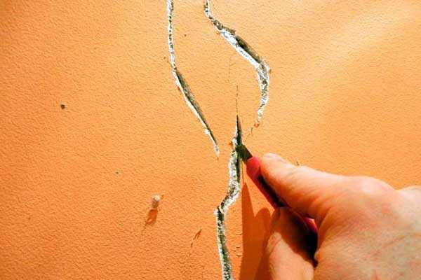 - Слегка расширьте и углубите трещину шпателем. Цель – обеспечить проникновение ремонтного раствора внутрь канавки.