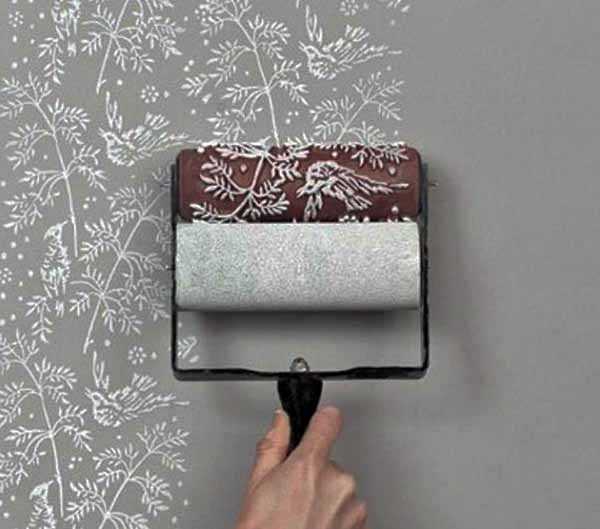 - воспользоваться специальным фактурным валиком и украсить стенку повторяющимся орнаментом, похожим на обои.