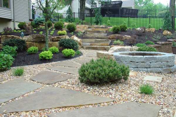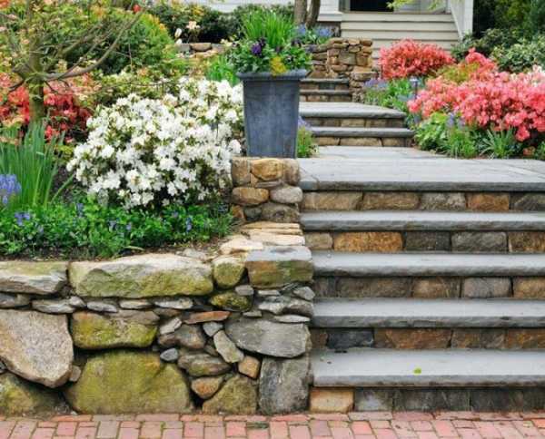Камень это очень популярный материал, который используется в ландшафтном дизайне. Он отлично переносит любые погодные условия. Так как это натуральный материал, то больше всего ценится его естественная структура, с трещинами, следами выветривания и т. д.