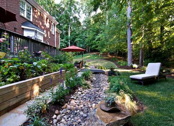 Если размер дачного участка позволяет, то создают ручей, вдоль которого высаживают цветы. Применение камней в ландшафтном дизайне позволяет добиться удивительных результатов.
