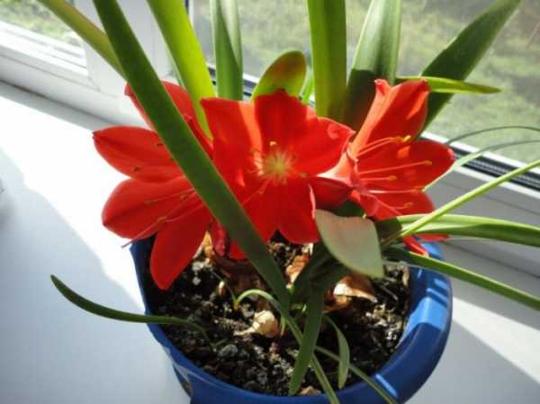 - Кливия. Многолетнее травянистое растение семейства Амариллисовых с длинными узкими листьями. Достигает в высоту 60 см. Популярна среди флористов из-за лояльности к условиям содержания и активного ежегодного цветения. Кливия цветет только один раз в году. Повторного цветения ни при каких условиях добиться нельзя.