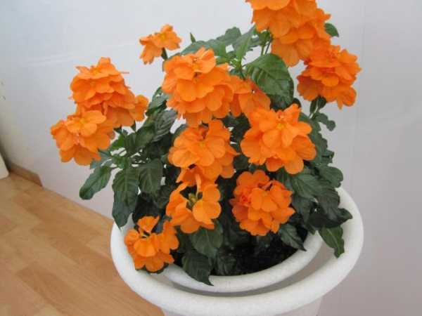 - Кроссандра. Лиственный кустарник семейства Акантовых высотой до 1 м. Цветет с начала весны и до осени. Не выносит прямых солнечных лучей, от которых получает ожоги, однако в условиях скудного освещения сбрасывает цветки.