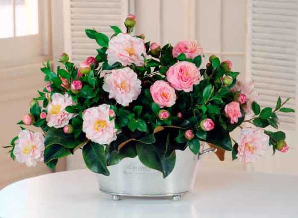 - Японская камелия. Цветок семейства Чайных родом из Юго-Восточной Азии. На родине достигает в высоту 6 м, однако в домашних условиях — не более 1,5 м. Камелия требовательна к условиям содержания, без соблюдения которых погибает.