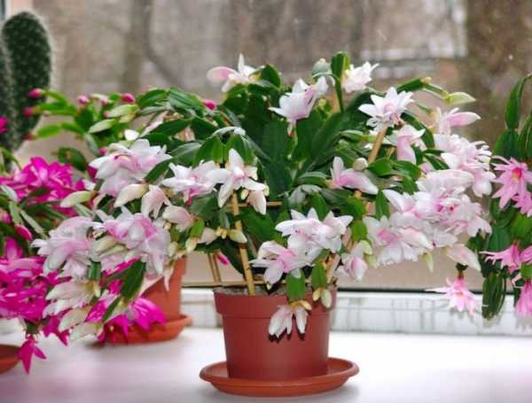 - Декабрист. Из названия уже понятно, что этот цветок стойко переносит морозы. Он способен прожить 15 лет и более, а во время самых злых морозов цвести так, словно на дворе жаркое лето. Декабристы встречаются в разных окрасах. Существуют лиловые, жёлтые, малиновые, белые, розовые цветки.