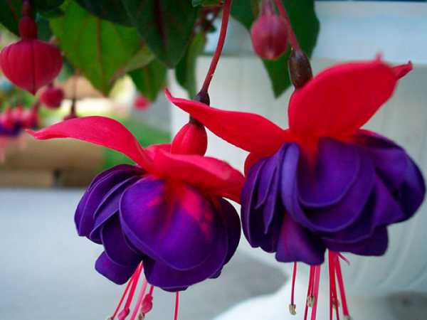 - Фуксия. Цветки этого растения напоминают колокольчики. Фуксии чувствительны к температуре и режиму полива. Так что за этими двумя параметрами вам придётся тщательно следить. Уход за фуксиями не слишком сложен, однако множество нюансов, которые следует учесть, делают фуксию не слишком подходящей для начинающих цветоводов.