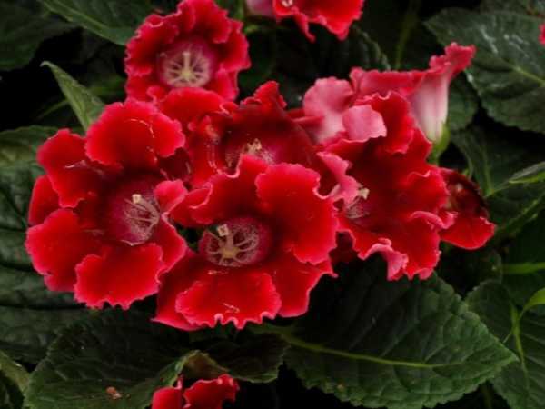 - Глоксиния. Цветёт в период с апреля по август. Цветоносы крупные, порой достигают 11 см в диаметре. Бывают белого, розового, красного и пурпурного оттенков. Любит свет, но не открытое солнце, умеренный полив, влажность не менее 50% и периодическую пересадку.