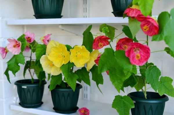 - Абутилон. Иначе его называют «комнатным клёном». Цветение начинается весной и заканчивается осенью. Чем больше сокращается световой день, тем меньше соцветий формируется. Листовые пластины напоминают кленовые, цветки похожи на разноцветные фонарики. Растение является быстрорастущим, любит воду, средние показатели температуры (19-24 градуса), требует периодической подрезки.