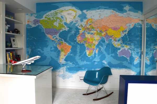 Яркая карта во всю стену – нестареющий вариант оформления стен в детской, имеющий еще и полезное практическое применение для любого школьника.