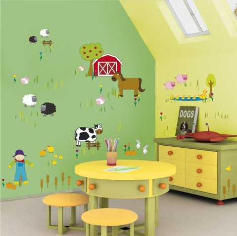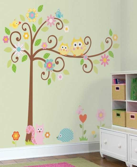 Для деток постарше комнату можно декорировать яркими цветными рисунками. Изящные бабочки, красивые цветочки, всевозможные зверьки, мультипликационные герои, сказочные персонажи отлично развивают фантазию и порадуют самых любопытных непосед.