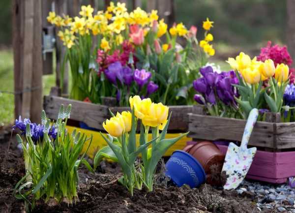 - Весенние луковичные. В первом ряду посадите самые красивые весенние луковичные цветы (тюльпаны, нарциссы, пролески и другие). Выбирайте сорта с белой, розовой или желтой окраской. Они помогут ранней весной сделать клумбу восхитительной, а затем их увядающие стебли и листья, прикроют отросшие кустики очитка. Вам понадобится примерно 20 штук луковичных цветов.