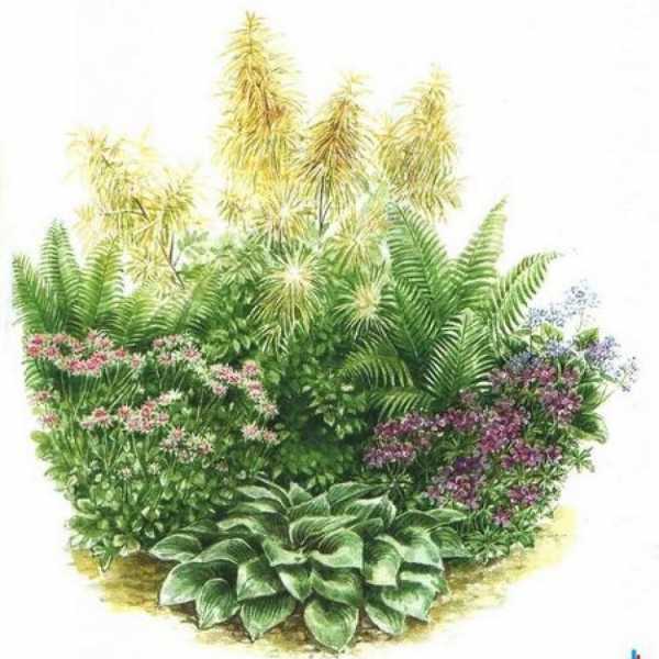 На притененном участке также можно обустроить симпатичный цветник. Дизайн такой клумбы из многолетников потребует подбора определенных теневыносливых видов и сортов растений. Наш вариант представляет собой треугольник примерно 2х3х3 метра.