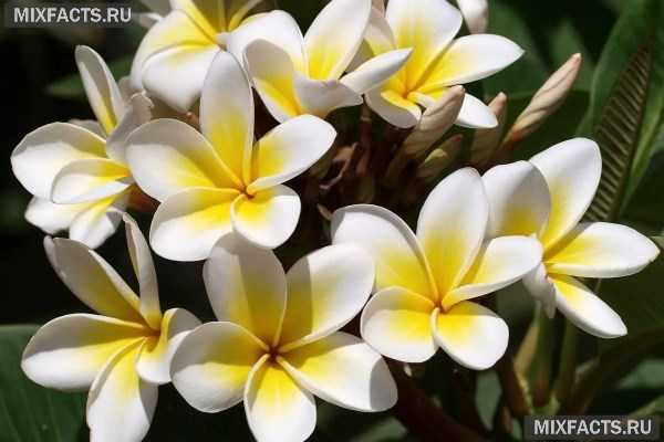Плюмерия, или франжипани — тропические цветковые кустарники из рода Кутровые, включающий 10 разновидностей. Ареал естественного обитания — Карибские острова, Мексика, Калифорния, Таиланд. Ее бутоны истончают легкий цитрусовый аромат. Красивая пятилепестковая завязь белого оттенка с желтоватой серединкой, плотным стеблем и вытянутыми овальными листками — отличительные внешние признаками плюмерии. В мягкой климатической зоне франжипани культивируется в открытом грунте, а при более прохладных погодных условиях — исключительно в горшках или контейнерах. Период активного роста и цветения приходится на раннюю весну, но лишь при постоянном орошении и удобрении минеральными подкормками.