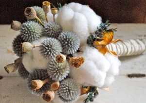 Хлопок — это самый распространенный участник зимних букетов невест, потому что напоминает снег. Чаще всего миксуется с сухоцветами, винтажными розами, брунией, сухим плодом лотоса, краспедией и эрингиумом.