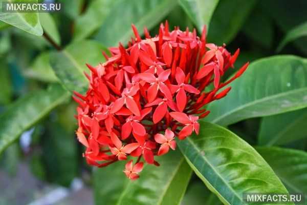 Иксора — растение из рода Мареновые, насчитывающего около 500 разновидностей. Данные представители флоры являются вечнозелеными кустарниками, произрастающими преимущественно в тропической влажной зоне — Бразилии, Чили, Мехико, Мадагаскара. Иксора имеет плотные кожистые листья, мелкие метельчатые цветки белого, красного или ярко-розового тонов. Иксора достаточно требовательна к почве и ее увлажнению, поэтому при домашнем выращивании необходимо тщательно следить за этим пунктом. Красные соцветия используются в индийской народной медицине.