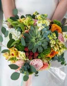 Современные свадебные букеты составляются из разных цветов, даже из полевых или садовых, хотя чаще цветы, которые с виду очень похожи на полевые, все же выращены в специальных условиях для промышленной срезки и являются более стойкими по сравнению со схожими, выращенными в естественной среде.