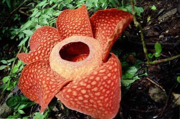 Крупнейший вид цветков – раффлезия, которая привлекает внимание не только внушительными размерами, но и оригинальным внешним видом. Это растение было обнаружено на острове Ява еще в XVIII веке. Диаметр его цветков достигает 100 см при максимальном весе до 10 кг. Сам цветок представляет собой пять мясистых лепестков, которые покрыты пятнами сверху. Каждый лепесток толщиной в 3 см и длиной до 46 см. Но не самый приятный запах у раффлезии – тухлого мяса.
