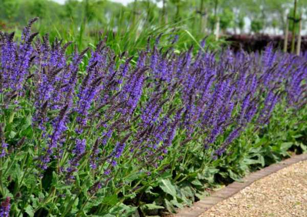 Шалфеи — многолетники цветущие все лето при надлежащем уходе. Растение от 35 до 90 см высотой. Очень красивы сорта «Blue Hill» с лавандово-голубыми и «May Night» с лилово-голубыми цветками, собранными в эффектные соцветия-свечи.