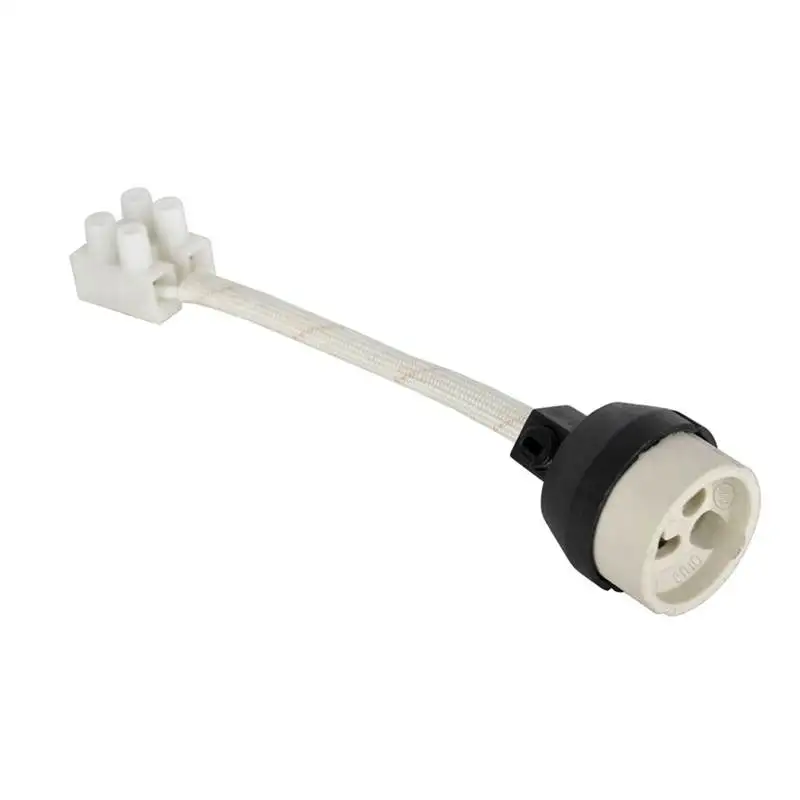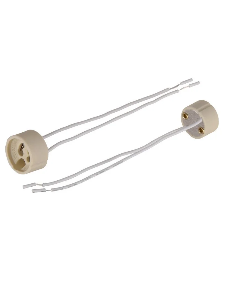G4.0, G5.3 и G6.35 Основание Подпружиненное двухконтактное светодиодное/галогенное фарфоровое гнездо с утопленными отверстиями и 10-дюймовым разъемом.