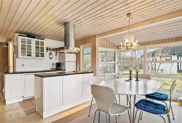 Внутри домик имеет современную открытую планировку со множеством подсобных помещений. Кухня и гостиная объединены в одно пространство, а спальня вынесена в уютный уголок.