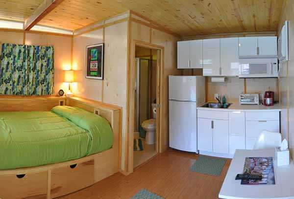 Он имеет очень скромные размеры и в нем нет не только лишних комнат, но даже лишних стен! Не считая традиционно отгороженной ванной комнаты, все пространство внутри этого дома — единое помещение.