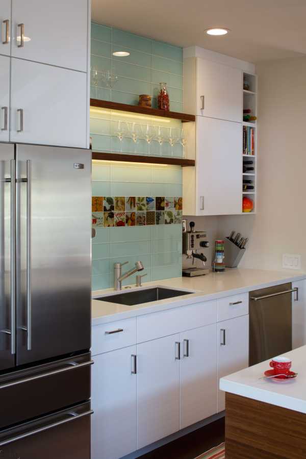 Современная кухня со стороны столовой оборудована высокой барной стойкой, которая служит как местом для завтрака, так и дополнительным местом для гостей во время вечеринок.