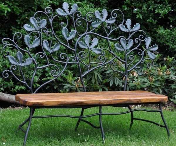 Кованная садовая мебель смотрится очень элегантно и не утяжеляет дизайн. Но лучше, если кованые элементы в мебели сочетаются с деревом. Такая скамейка отлично будет смотреться как под кованой аркой или перлогой, так и в окружении садовых деревьев и кустарников. Чаще всего кованые элементы применяются в качестве ножек и поручней-опор. Спинка и сидение скамейки изготавливаются из дерева. Кованые элементы хороши тем, что их можно выполнить исходя из любого эскиза, тем самым подобрать дизайн скамейки на любой вкус.