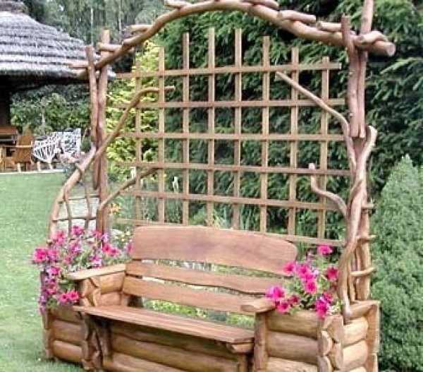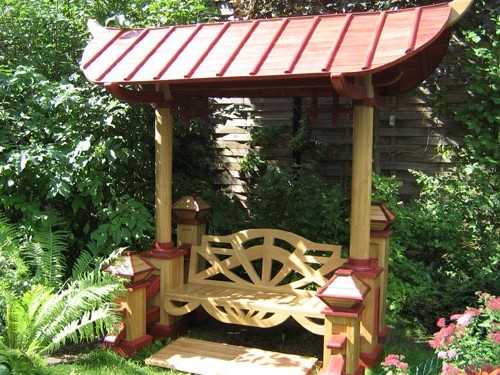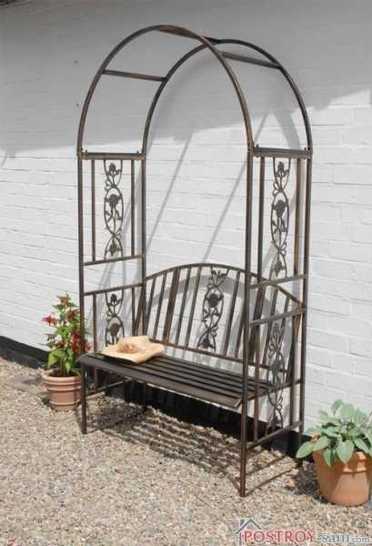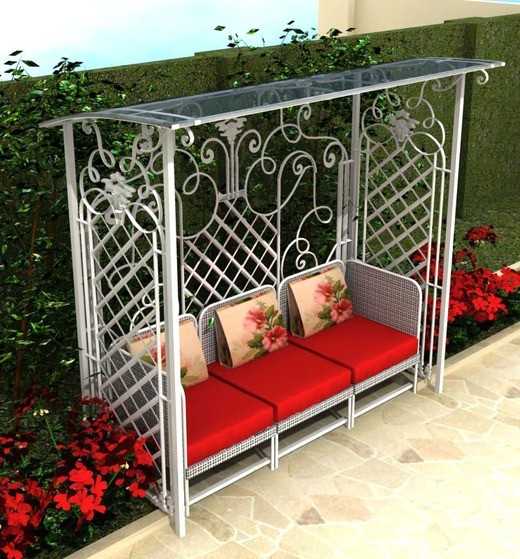 На спинке и боковых сторонах можно разместить красивый узор, а сиденье скамейки можно сделать деревянным или кованым. Арка может быть заплетена вьющимися быстрорастущими растениями, такими как девичий виноград, декоративный вьюн, клематис и плетистые розы. В дополнение ко всему на арку можно повесить кашпо с ипомеями, настурциями и петуньями.