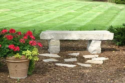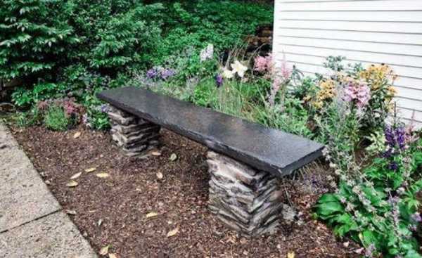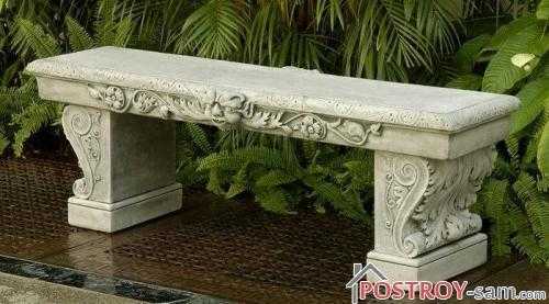 Скамейки, выполненные из камня, не очень удобны в применении, но способны принести в дизайн дачного участка дух старины, так как всегда выглядят как не из нашего времени. Использовать по назначению каменную скамейку можно только в теплое время года и при этом на нее не должны падать прямые солнечные лучи, иначе сидение скамейки будет слишком горячим. Минусом каменных скамеек является и их достаточно высокая стоимость.