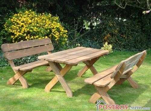 Деревянный стол и скамейки садовые