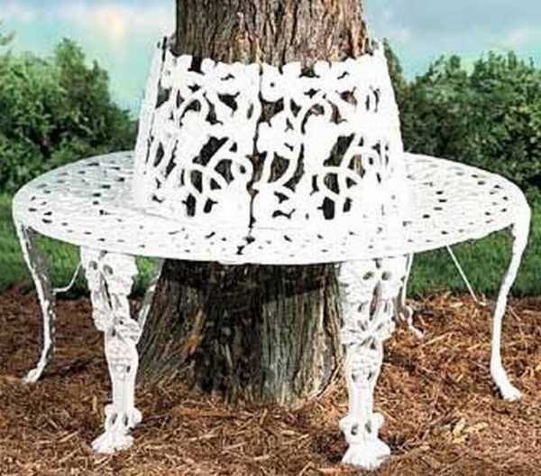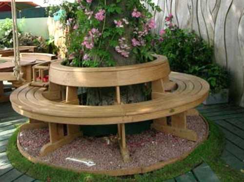 В тени большого раскидистого дерева можно установить круговую садовую скамейка, которая станет местом, где можно будет укрыться от палящего солнца в ясный летний день. Такую конструкцию легко установить самостоятельно. Для постройки круговой скамейки можно использовать практически любой подручный материал: доски, металлические трубы, жерди. Круговую скамейку можно установить вокруг небольшого садового фонтана или красивой цветочной клумбы. Плюсом такой скамейки является то, что на ней смогут спрятаться от жаркого солнца одновременно большое количество людей и при этом вся конструкция не займет много места в саду.