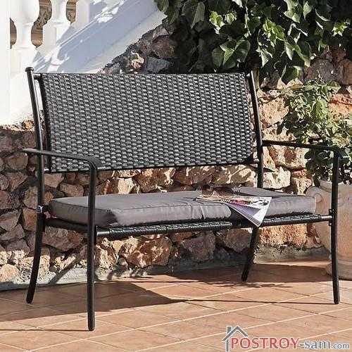 В настоящее время очень популярны скамейки, у которых имеется металлическая основа и спинка с сиденьем из ротанга.