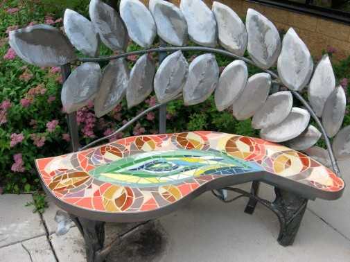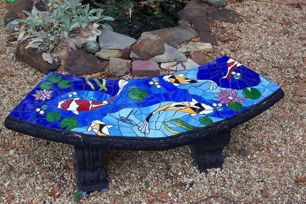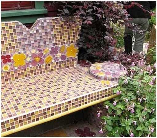 Скамейка, украшенная яркой мозаикой, создаст в саду атмосферу постоянной сказки и яркого праздника. Кроме того такая садовая скамейка очень практична. Ей не страшен ни снег, ни дождь. Содовые скамейки, украшенные мозаикой способны поразить всех яркими узорами и оригинальной формой. Такую оригинальную скамейку можно сделать из самой обычной конструкции. Материалом для мозаики может быть что угодно: бой посуды, плитки, разноцветного стекла, галька, крышки от бутылок и др. Что еще украсить мозайкой.