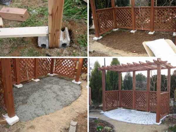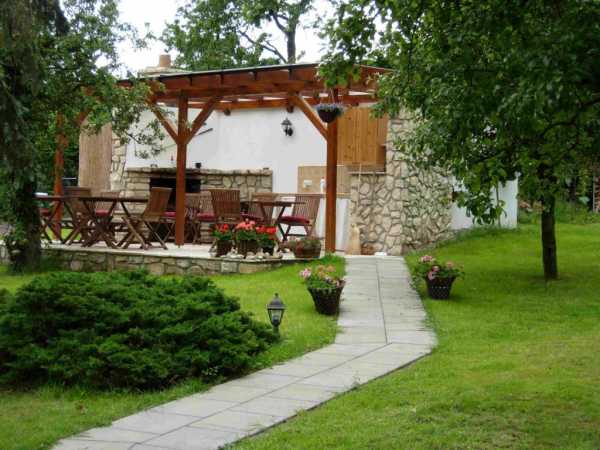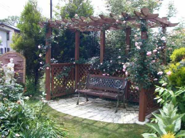 Намного лучший вариант, если есть возможность, установить беседку и посадить в её пределах вьющиеся растения. Они дадут укрытие от солнца в жаркую пору и будут радовать цветами. Единственное, что следует делать, выращивая их, задавать направление их росту. Среди таких растений: клематис, гортензия, настурция, душистый горошек, древогубец, жимолость, плющ, актинидия, глициния и др. Данные растения будут украшать двор на протяжении всего сезона и будут рады небольшому количеству удобрений, отблагодарив за это большей пышностью. Красивое оформление дачного участка фотографии: