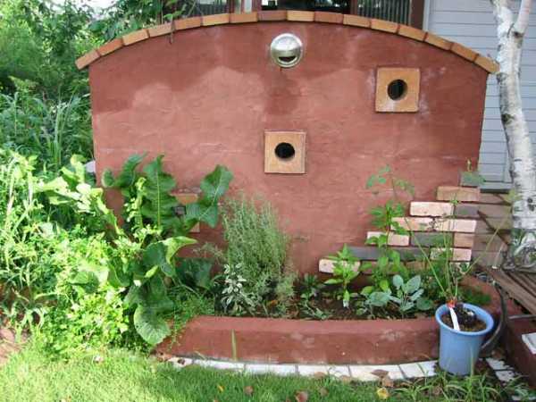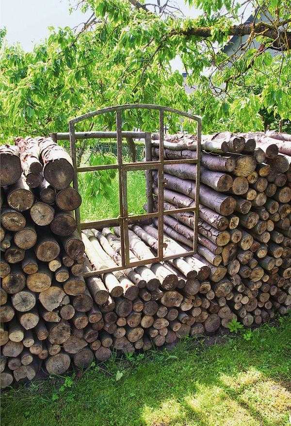 Можно также соорудить примечательный ландшафтный объект — дровяник с окошком.