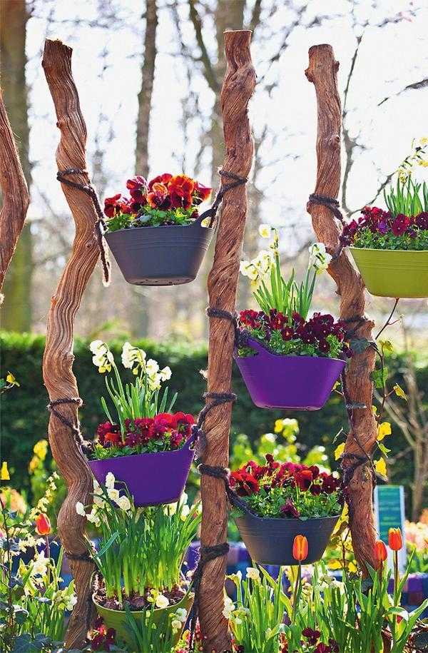 Чтобы освоить пространство по вертикали, не обязательно покупать подвесные кашпо. Есть множество других интересных вариантов. Например, можно подвесить заполненную растениями корзину из проволоки на ветке дерева. Все, что вам для этого нужно, — толстый сук и крепкая веревка. Только не забудьте выстлать емкость нетканым материалом, чтобы земля не просыпалась сквозь щели.