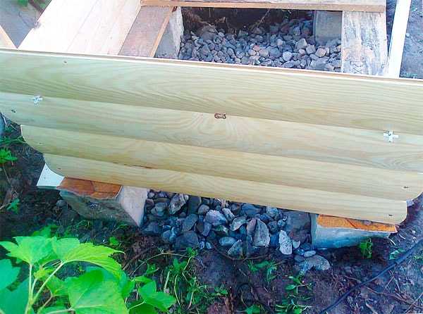 - Снизу крепим обвязку из брусьев. На них устанавливаем либо купленный заранее душевой поддон, либо решетку из реек, соединенных с зазорами в 0,5 – 1 см для вытекания воды.