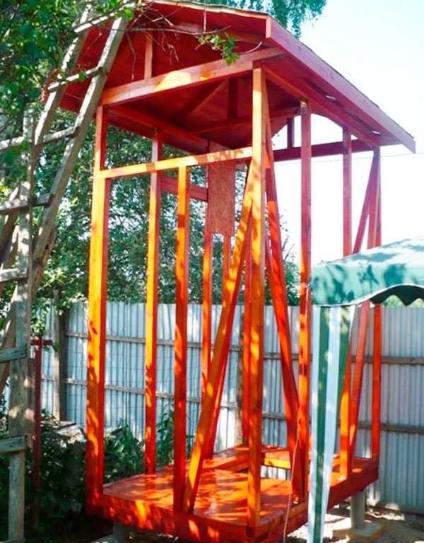 - Затем монтируется каркас душа. В качестве основания под каркас можно использовать обработанные водоотталкивающими составами ацеидные трубы.