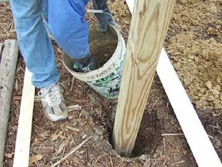 - В эти ямы устанавливаются деревянные или металлические столбы. Важно помнить, что та часть столба, которая будет находиться ниже уровня земли должна быть обработана гидроизолирующими материалами, например, обёрнута рубероидом. В качестве уплотнителя, необходимого для прочного удержания столба в земле, можно использовать кирпичный бой или бетон, если речь идёт о металлическом каркасе.