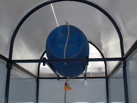 - После того как каркас будет изготовлен и установлен, наверх монтируется бак для воды, а в качестве стен будет служить какая-либо непрозрачная плёнка, натянутая между опорами.